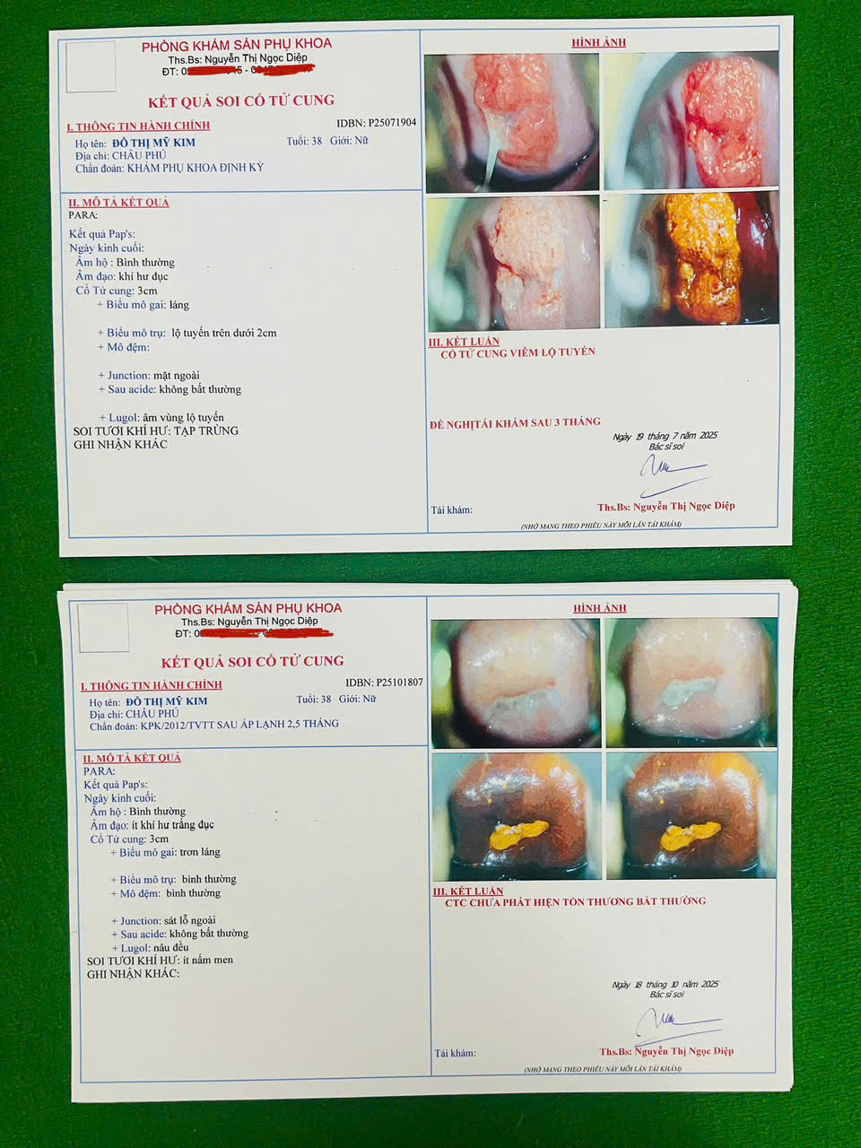 Hình ảnh thực tế trước và sau khi áp lạnh, sau khi áp lạnh được 30 ngày thì cổ tử cung láng đẹp trên cả tuyệt vời, đó là niềm vui của bác sĩ vì đem lại công nghệ tốt nhất cho bệnh nhân áp lạnh công nghệ tiên tiến nhất của Nhật Bản, hạnh phúc của bệnh nhân vì đã được điều trị dứt điểm căn bệnh lộ tuyến kéo dài.